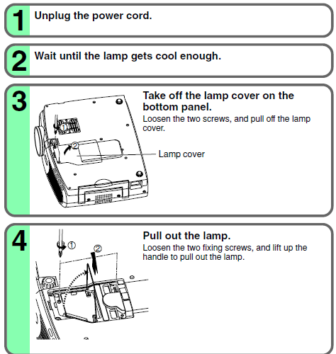 • When reinserting the power cord before the lamp has cooled, please wait until the lamp has cooled sufficiently